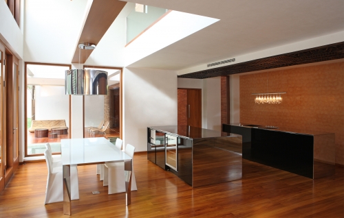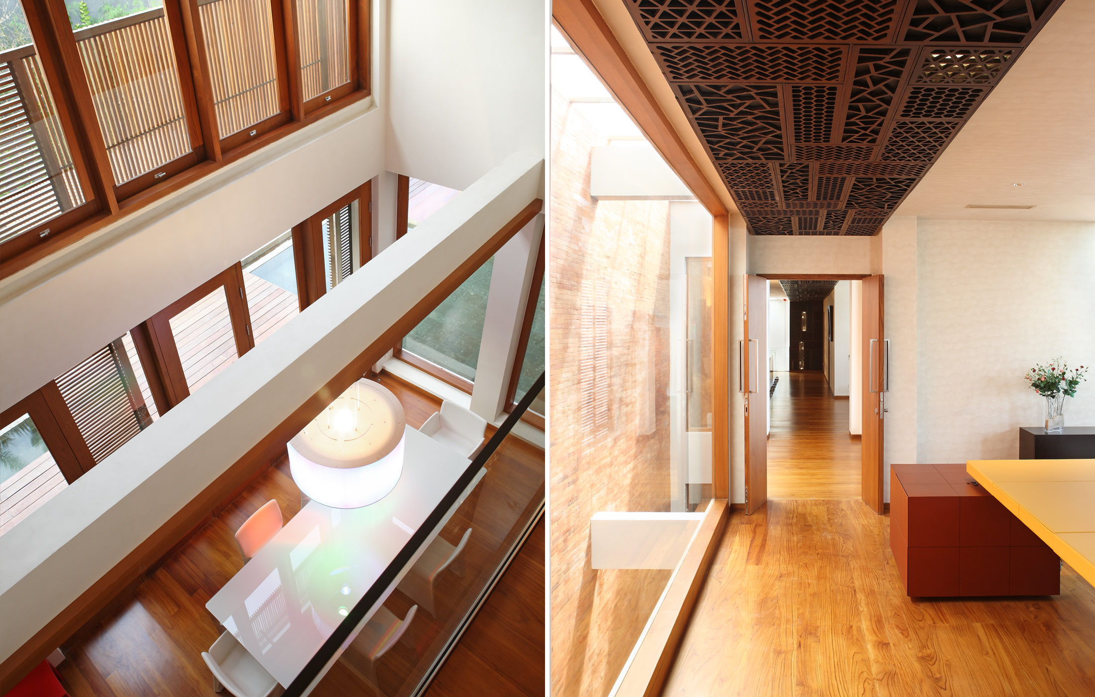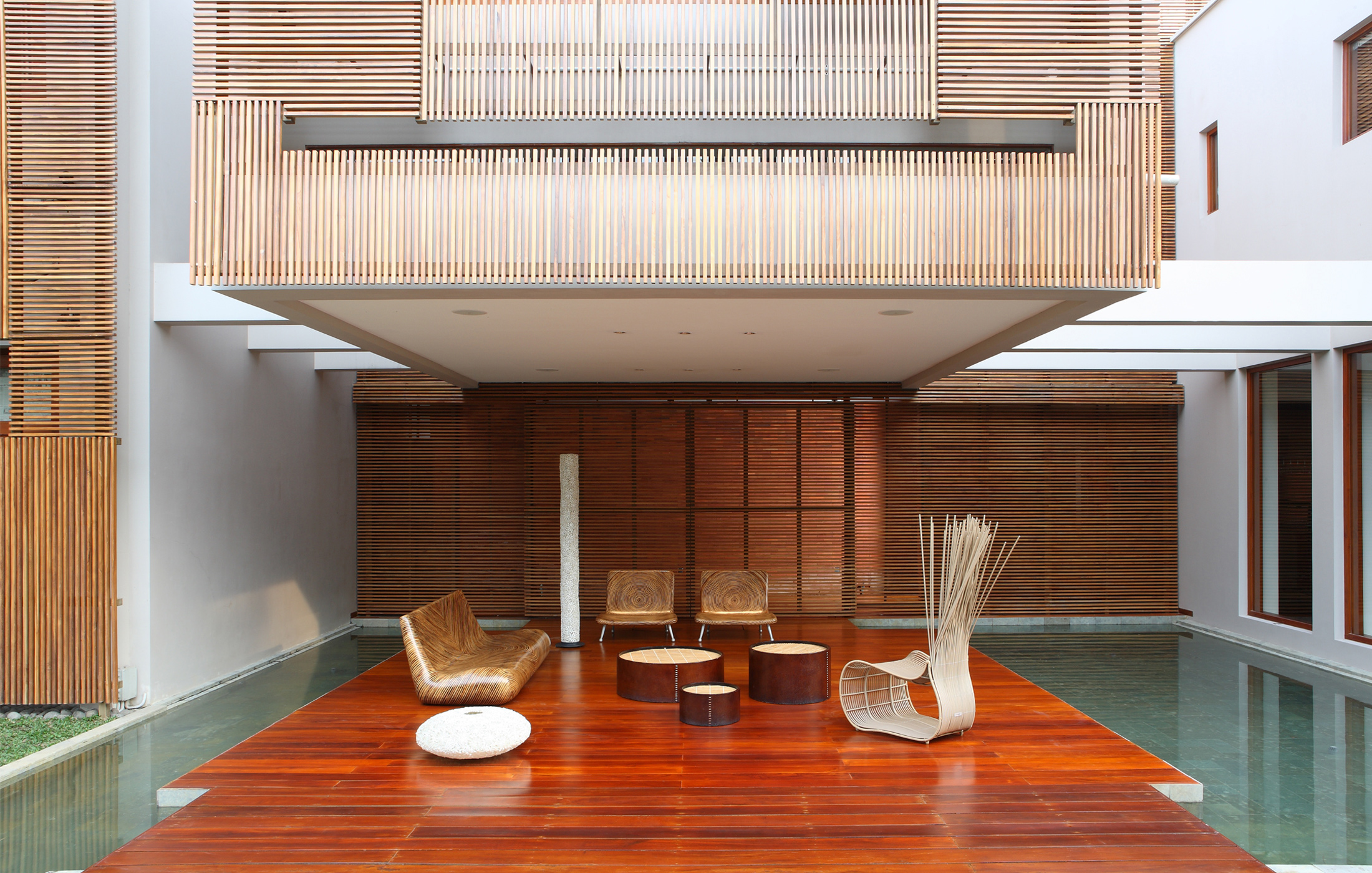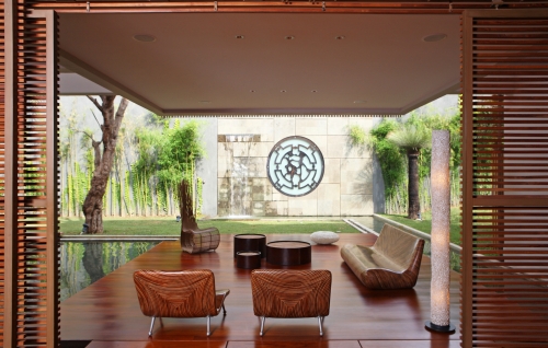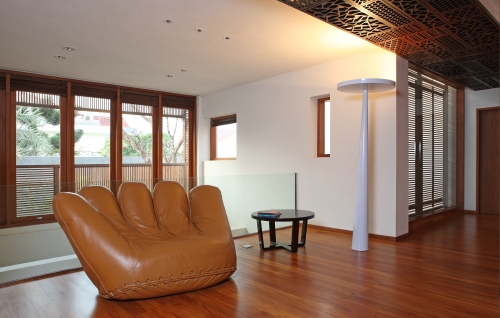 该案位于爪哇市度假村,设计理念是低碳节能。外立面由三层百叶窗覆盖,百叶窗的几何图案和谐交融。室内,无论一楼,还是二楼,极目远眺,都可以观赏花园景色。可以遮挡的室外活动空间,与室内空间自然的成为一体。