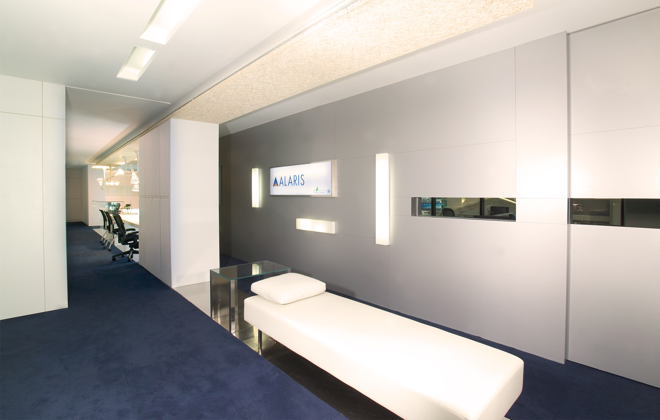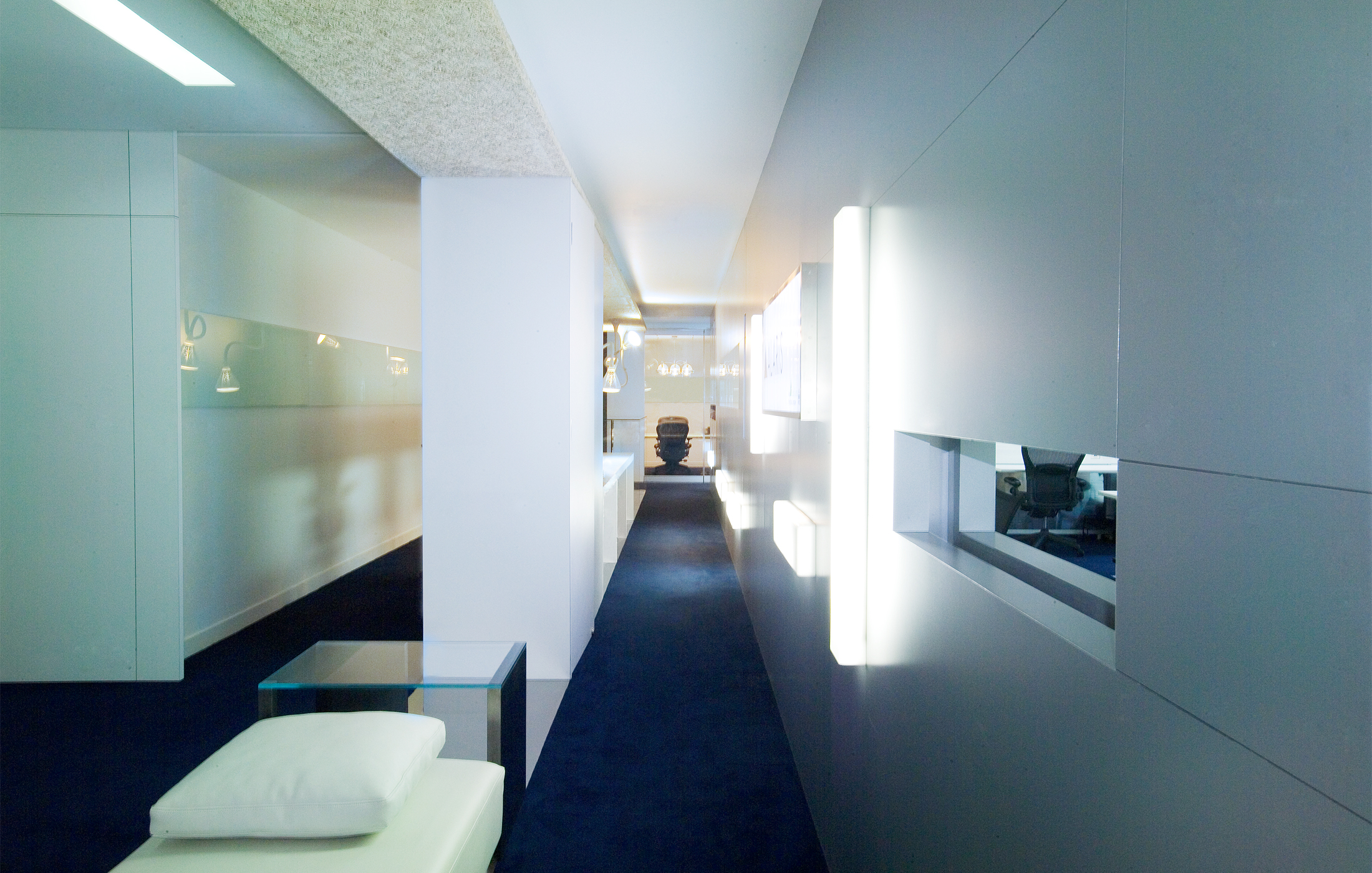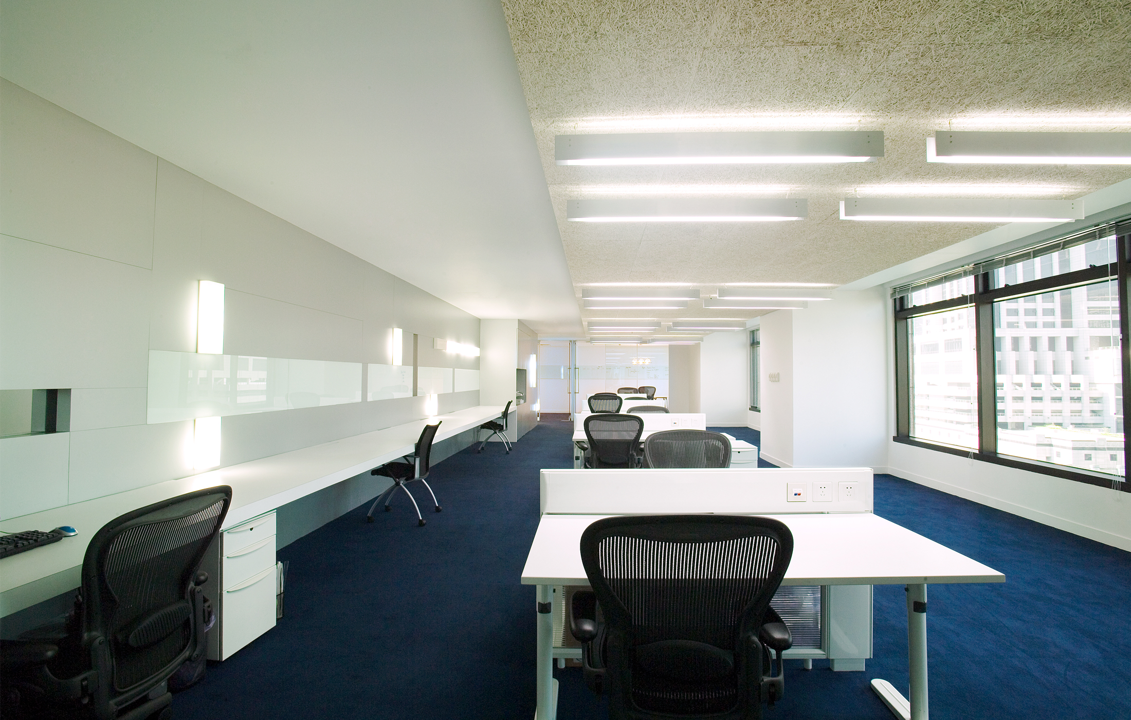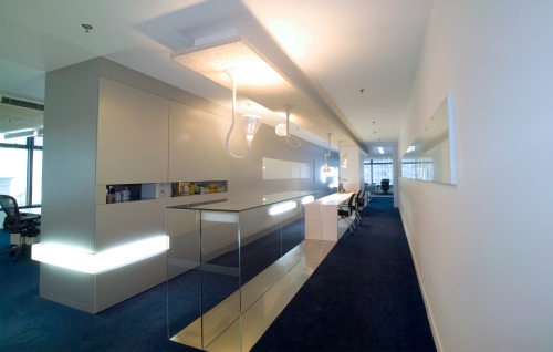 该案是现代风格的办公空间,照明设计是主要元素。前台区域的非传统设计,使得明亮大厅引人入胜。天花上可以看到隔音材料,柜子靠墙排列,井然有序,整个空间看上去极具创意。
