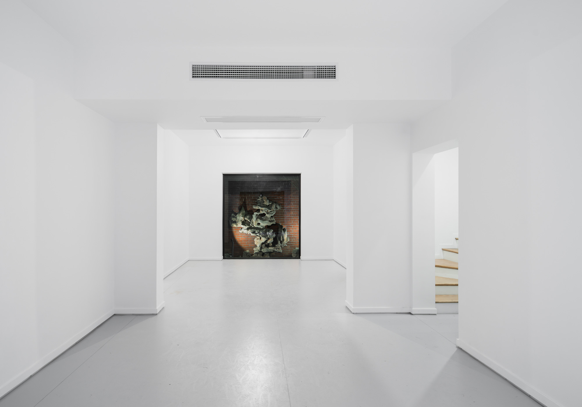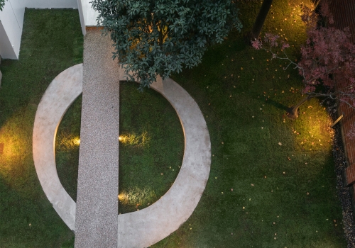 关于花园,我们设计了一个绿色庭院,供艺术家和参观者使用。一条中央小路穿过庭院,举办艺术表演,而穿过T台的水泥环则是为了在欣赏艺术表演的同时为游客提供座位。这种创新设计的表演舞台空间被沿着围墙放置的两面镜面不锈钢板反射放大。通过这种方式,展览空间被扩展到室外花园区域,一个集思广益的空间。