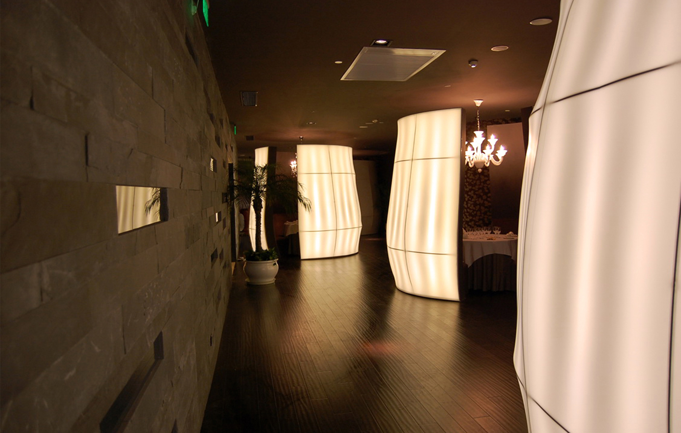 The Xintiandi location of this high-end Shanghai restaurant chain features an elegant, cozy cocktail lounge that opens onto a foyer where circular backlit pods enhance the uniqueness of the dining experience.